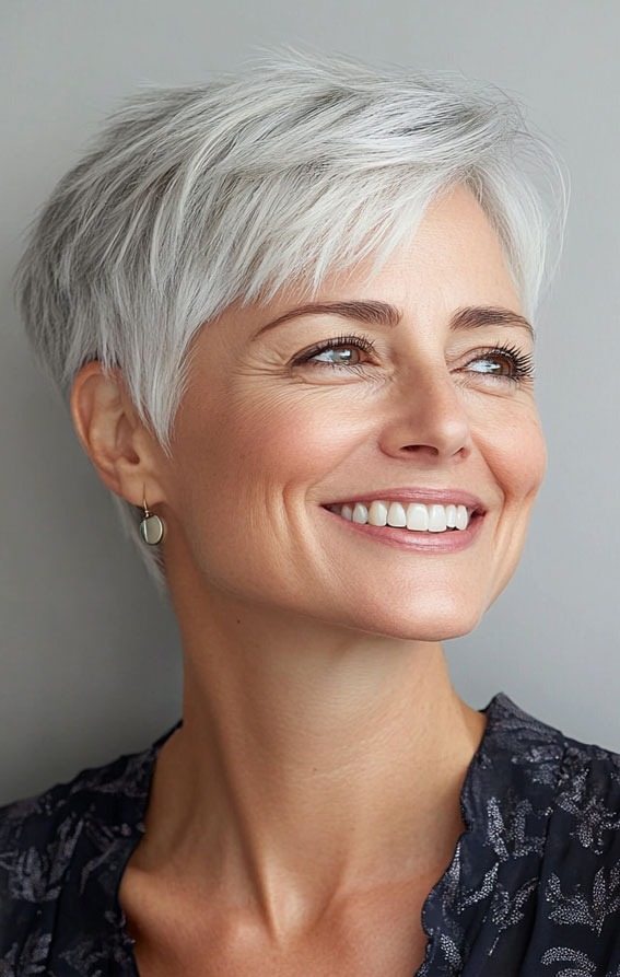 The layered pixie cut features multiple length variations that create soft, flowing movement reminiscent of feathers or flower petals. This feminine approach to pixie cutting adds romantic elegance while maintaining the cut’s essential character. Strategic layering prevents harsh lines while adding volume and texture that flatters mature women particularly well. The graceful layers require minimal styling – simply tousle with fingers and light styling cream for effortless elegance.